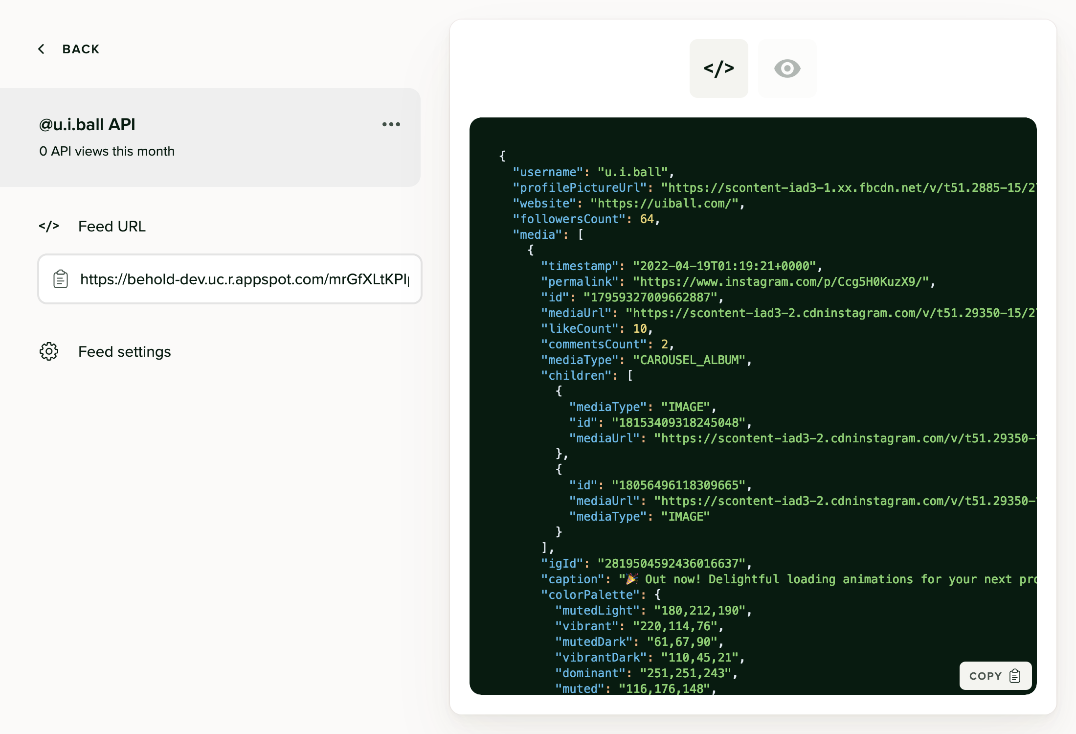 Aside from our widgets, Behold offers an extremely simple way to access a JSON feed of Instagram posts, so you can build your own UI.